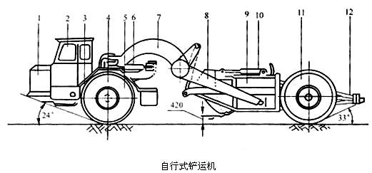 1- 發動機;2-駕駛室;3-傳動裝置;4-中央框架;5-前輪;6-轉向油缸; 7-轅架-;8-Ⅱ型架; 9-鏟運斗;10-斗門油缸;11-后輪;12-尾架
