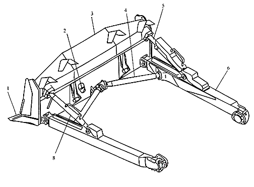 1-刀片;2-切削刃;3-鏟刀;4-中央拉桿;5-傾斜油缸;6-頂推梁;7-框銷;8-拉桿(斜撐桿)