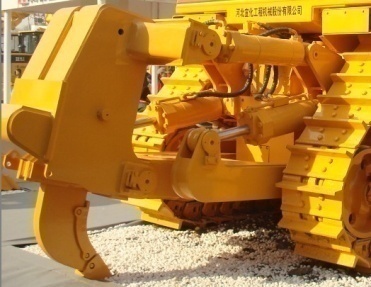 一般大中型履帶式推土機的后部有懸掛液壓松土器,松土器有多齒和單齒兩種。 多齒松土器挖鑿力較小,主要用于疏松較薄的硬土、凍土層等。單齒松土器有較大的挖鑿力,除了能疏松硬土、凍土外,還可以劈裂風化巖和有裂縫的巖石,并可拔除樹根。
