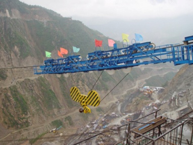 纜索型起重機如(3-5所示。構造特點是取物裝置的起重小車沿著架空的承載鋼絲繩索運行。承載索的兩端分別固定在主、副塔架的頂部,塔架固定在地面的基礎上。小車在鋼絲繩索上運行,起升卷筒和運行卷筒安裝在主塔架上,另一側副塔架上裝有調整鋼絲繩索張力的液壓拉伸機。應用在跨度特別大,地勢復雜、起伏不平或各種類型起重機難以駛達的工作場地。如林場、煤廠、江河、山區和水庫等。纜索型起重機一般是為已確定的工地專門制作的,它的結構和工作性能起決定于它所服務工地的輪廓尺寸和工作性質。