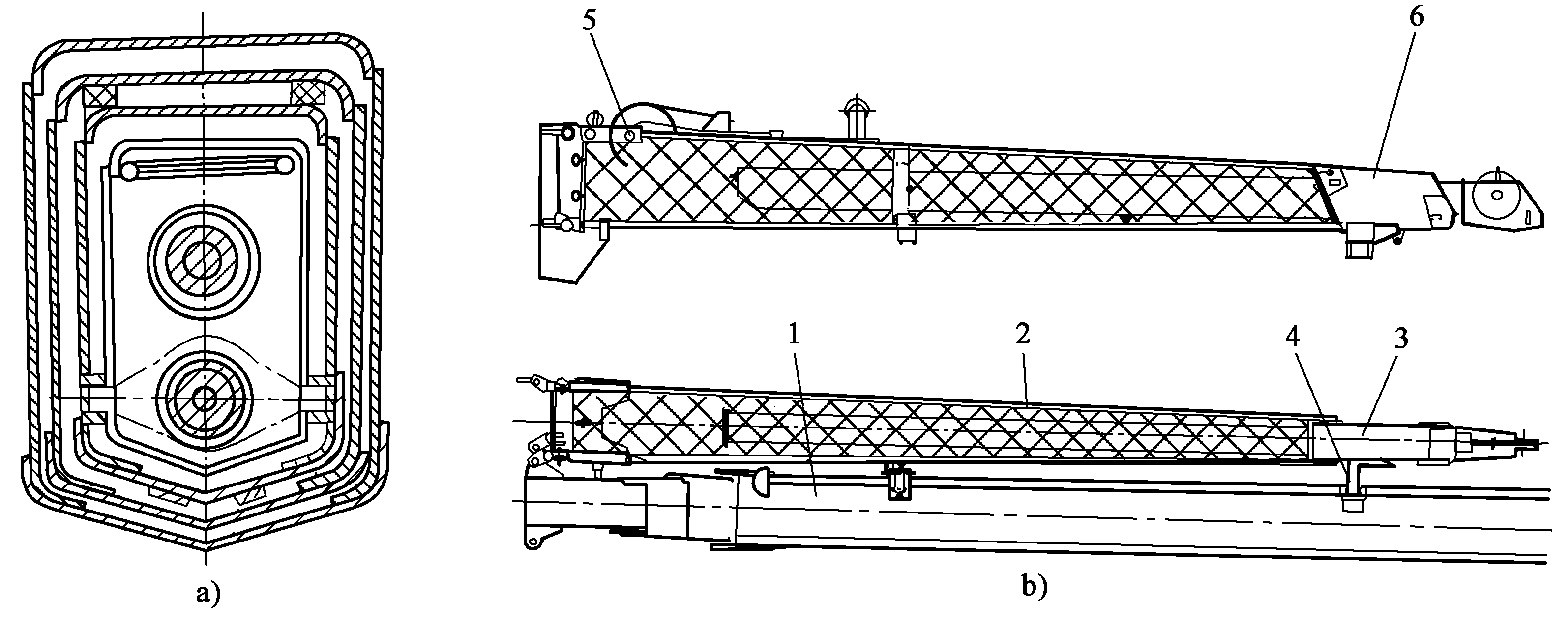 副臂架采用高強結構鋼制成。第一節副起重臂為桁架式結構,第二節副起重臂為箱形結構。第二節副臂套裝在第一節副臂內,靠托滾支承。工作時靠人工將二節副臂拉出,然后用銷軸6固定。通過調節軸銷5的位置,可實現5°、30°兩種副起重臂補償角的起重作業。整個副臂采用側置式,收存時置于主起重臂的側方,通過固定銷軸和拖架與主起重臂相連。(圖3-30)