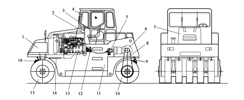 YL26輪胎壓路機(jī)由車架11、發(fā)動(dòng)機(jī)13、減速器6、后驅(qū)動(dòng)橋7、前輪總成15、后輪總成10、灑水系統(tǒng)9、操作系統(tǒng)3、轉(zhuǎn)向系統(tǒng)14、液壓系統(tǒng) 5和6、電氣系統(tǒng) 18等組成。