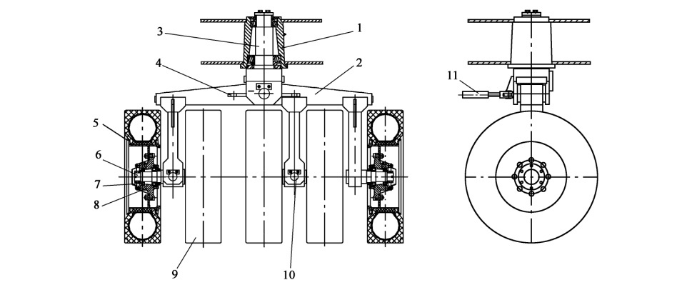 1-車架;2-擺動(dòng)架;3-轉(zhuǎn)向立軸;4-擺動(dòng)軸;5-輪輞;6-擺動(dòng)輪軸;7-軸承;8-輪轂;9-輪胎;10-軸;11-轉(zhuǎn)向油缸
