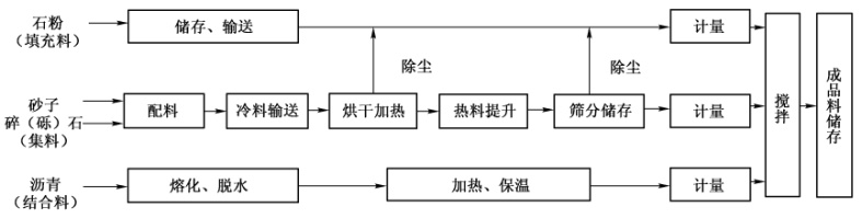 1-冷集料儲存及配料裝置;2-冷集料帶式輸送機;3-冷集料烘干、加熱筒;4-熱集料提升機;5-熱集料篩分及儲存裝置;
