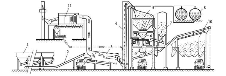 6-熱集料計量裝置;7-石粉供給及計量裝置;8-瀝青供給系統;9-攪拌器;10-成品料儲存倉;11-除塵裝置