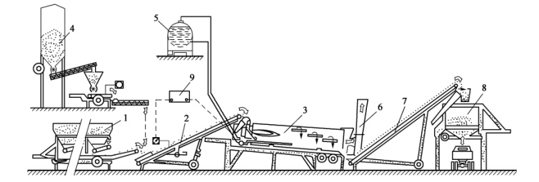 由于機型不同,其工藝流程亦不盡相同。目前國內外最常用的機型有兩種,一種是間歇強制式,一種是連續滾筒式。它們的工藝流程分別見圖。