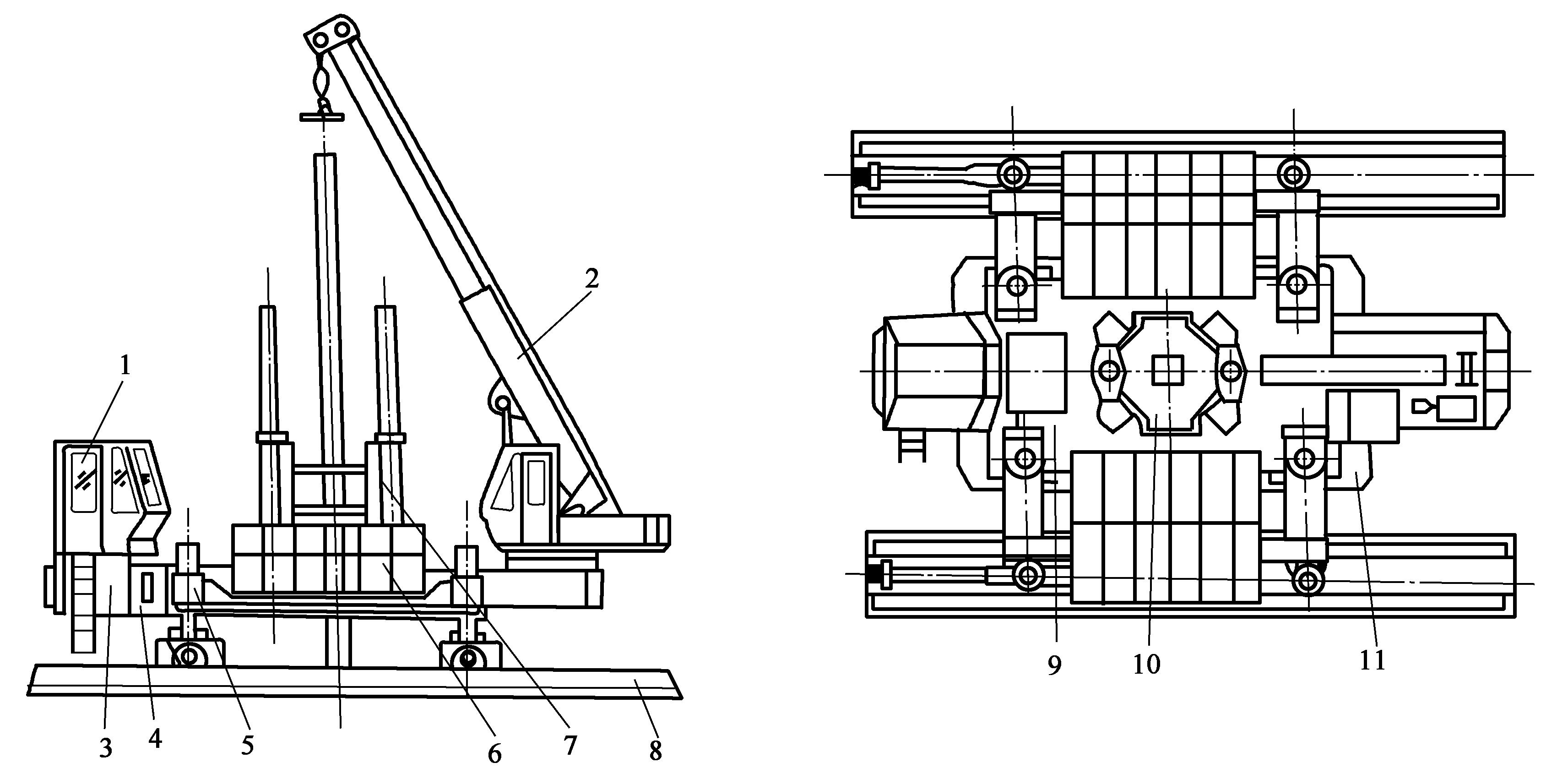 1操作室;2起重機(jī);3液壓系統(tǒng);4電器系統(tǒng);5支腿;6配重鐵;7導(dǎo)向壓樁架;8長船行走機(jī)構(gòu);9平臺結(jié)構(gòu);10夾持機(jī)構(gòu);11短船行走及回轉(zhuǎn)機(jī)構(gòu)