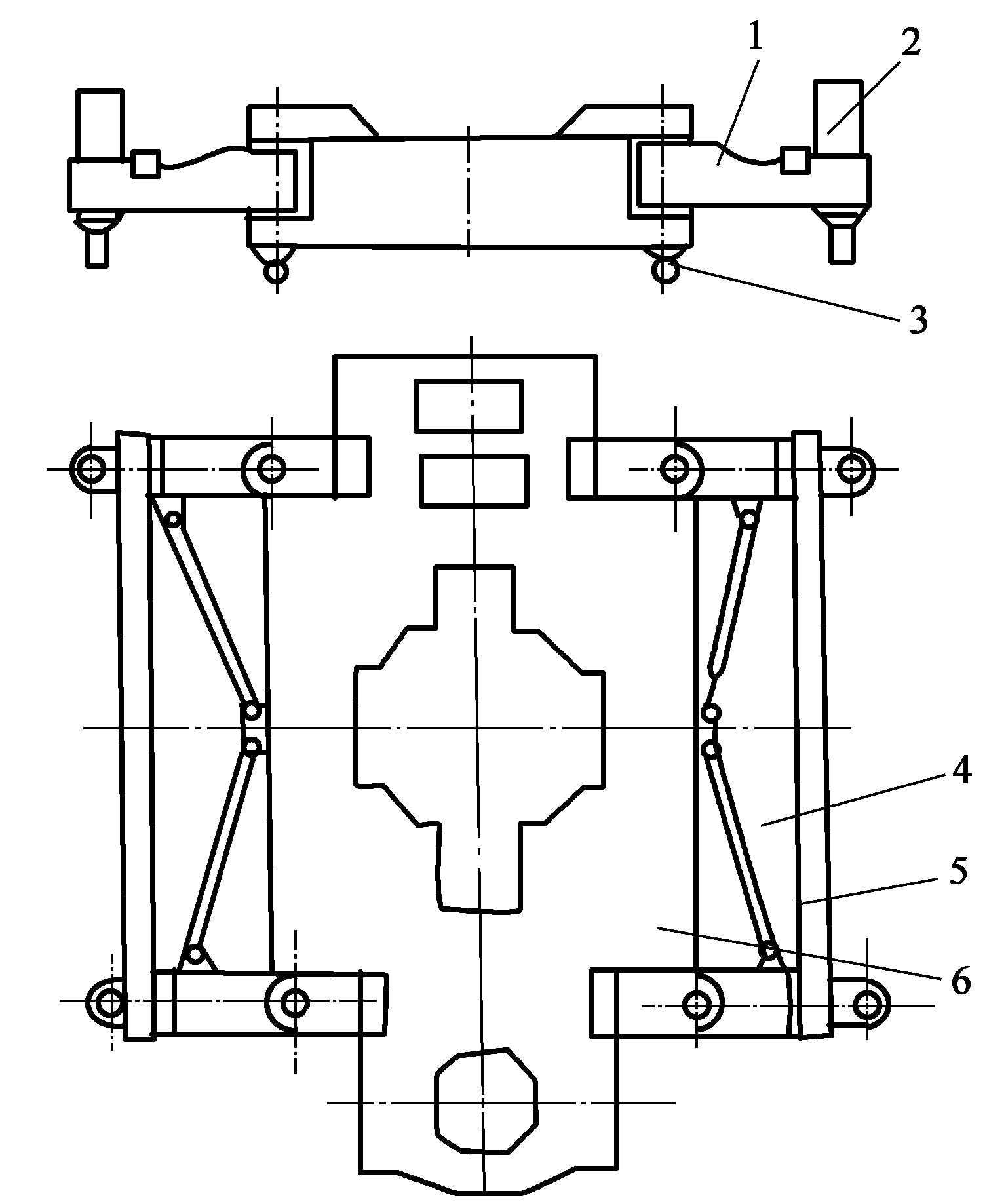 1 支腿;2 頂升液壓缸;3 球頭軸;4 拉桿;5 配重梁;6 平臺