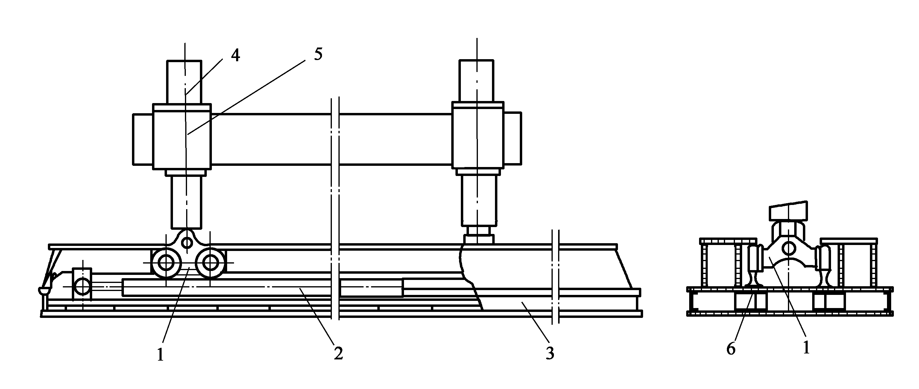 1 長船行走臺車;2 長船液壓缸;3 長船船體;4 頂升液壓缸;5 支腿;6 軌道