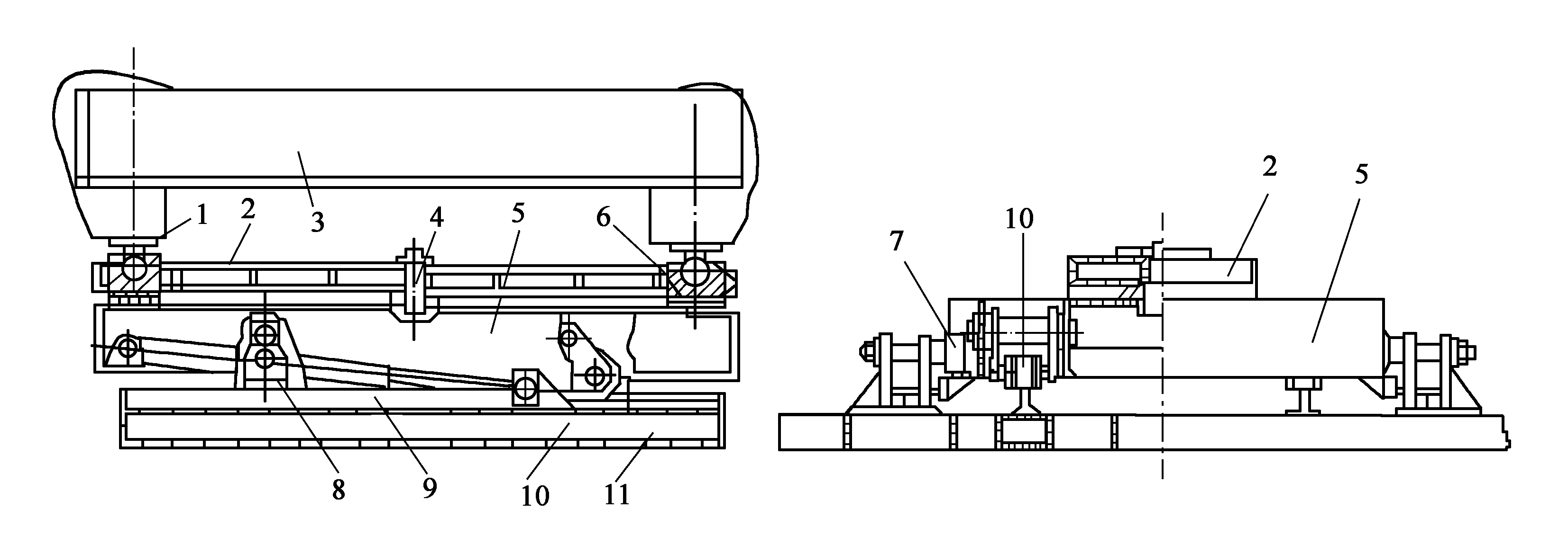 1球頭軸;2回轉(zhuǎn)梁;3底盤;4回轉(zhuǎn)軸;5行車梁;6滑塊;7滑塊;8掛輪支座;9短船液壓缸;10行走輪;11船體