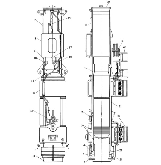 1-上活塞;2-燃油泵;3-活塞環;4-外端環;5-緩沖墊;6-橡膠環導向;7-燃油進口;8-燃油箱;9-燃油排放旋塞;10-燃油閥; 11-上活塞保險螺栓;12-冷卻水箱;13-燃油和潤滑油泵;14-下活塞;15-燃油進口;16-上汽缸;17-導向缸;18-潤滑油閥; 19-起落架;20-導向卡;21-下汽缸;22-下汽缸導向卡爪;23-銅套;24-下活塞保險卡;25-頂蓋
