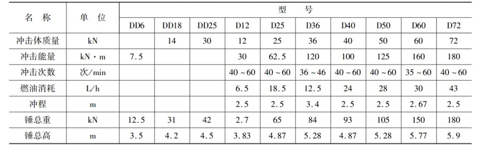 筒式柴油打樁錘和導桿式柴油打樁錘的性能見表2-2。