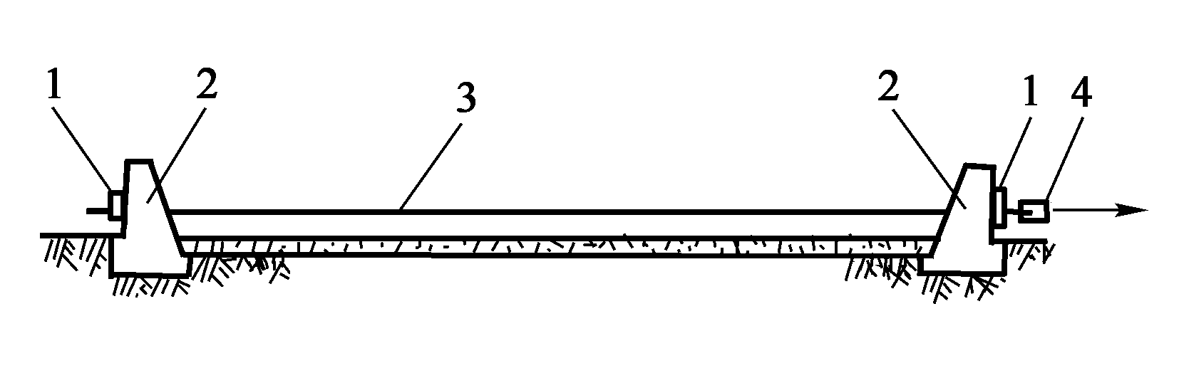 先張法為先張拉鋼筋,后澆筑混凝土。施工過程為:張拉機械4張拉鋼筋3后,用夾具1將其固定在臺座2上,澆筑混凝土,混凝土具有一定強度后,放松鋼筋,鋼筋回縮,使混凝土產生預應力。