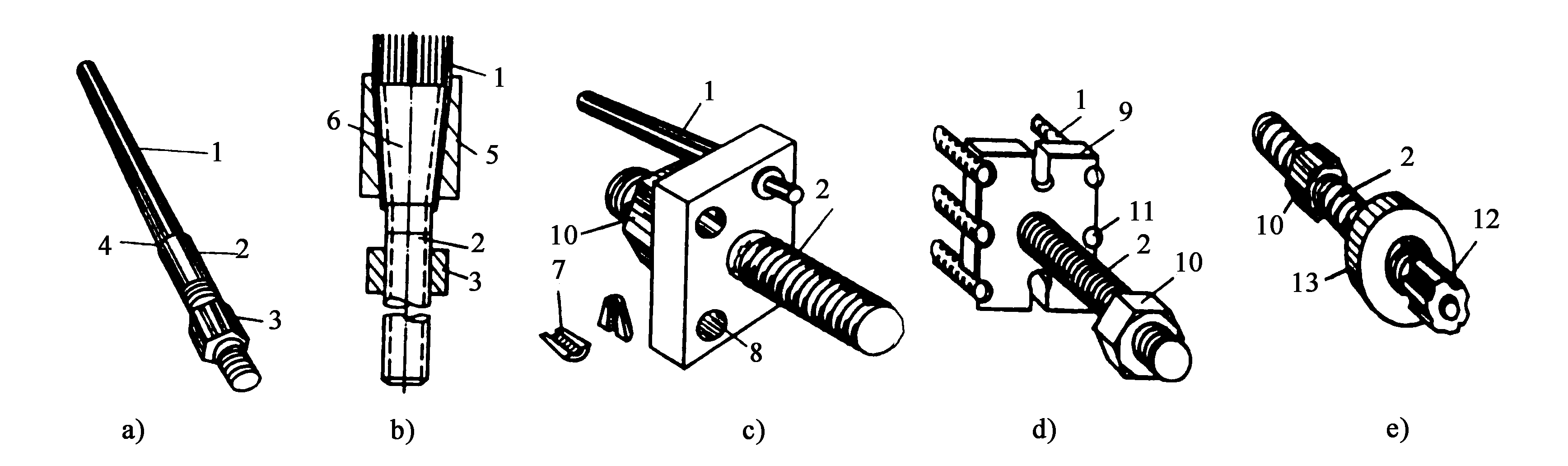 a)螺紋端桿錨具;b)錐形螺桿錨具;c)螺桿銷片夾具;d)螺桿鐓頭夾具;e)螺桿錐形頭夾具