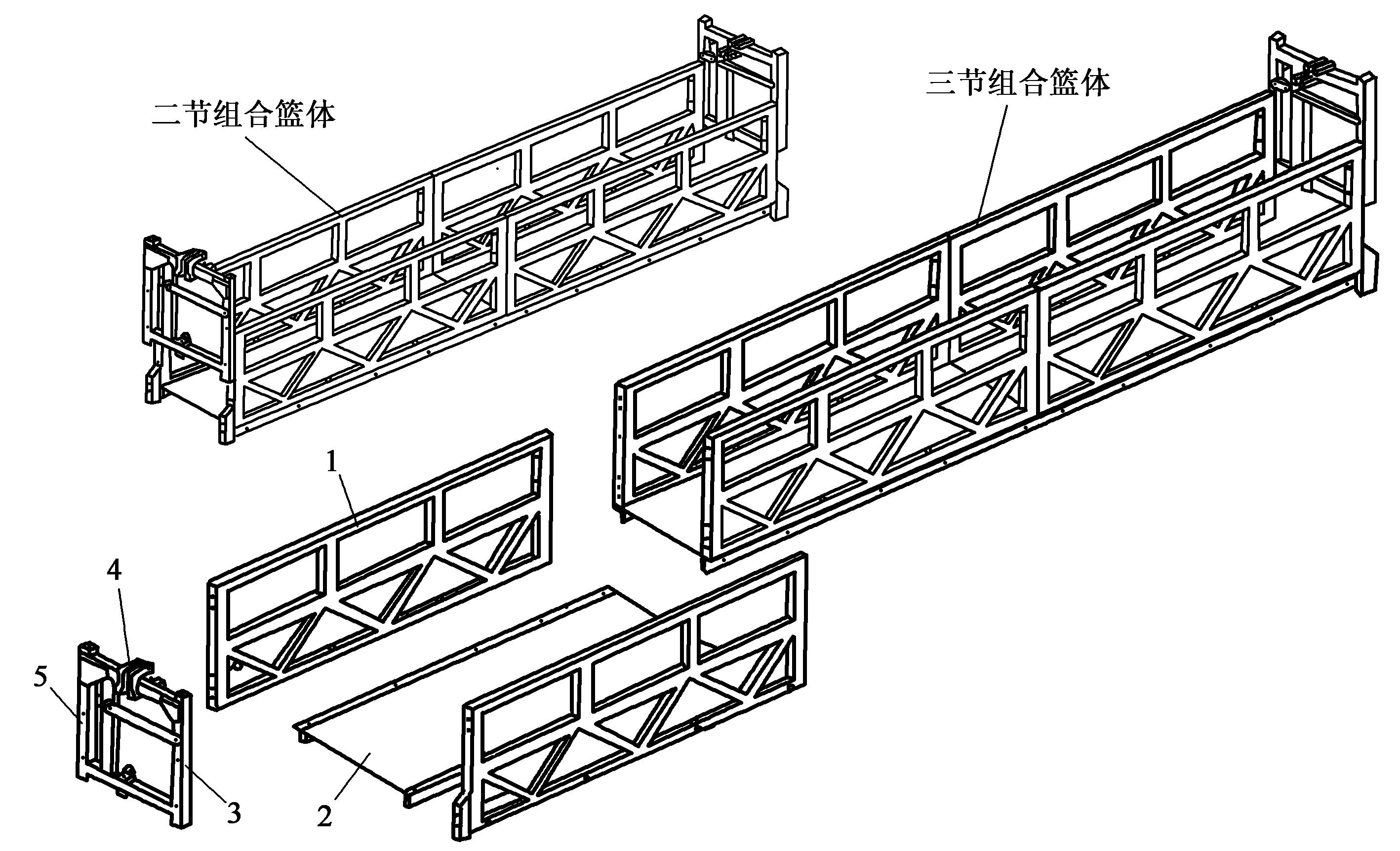 平臺籃體有整體式和組合式兩種。工程中常用組合式籃體,組合式籃體可由一到三節不同長度的籃體對接,用螺栓連接而成,如圖6-10所示。可根據實際工作需要改變籃體的長度。