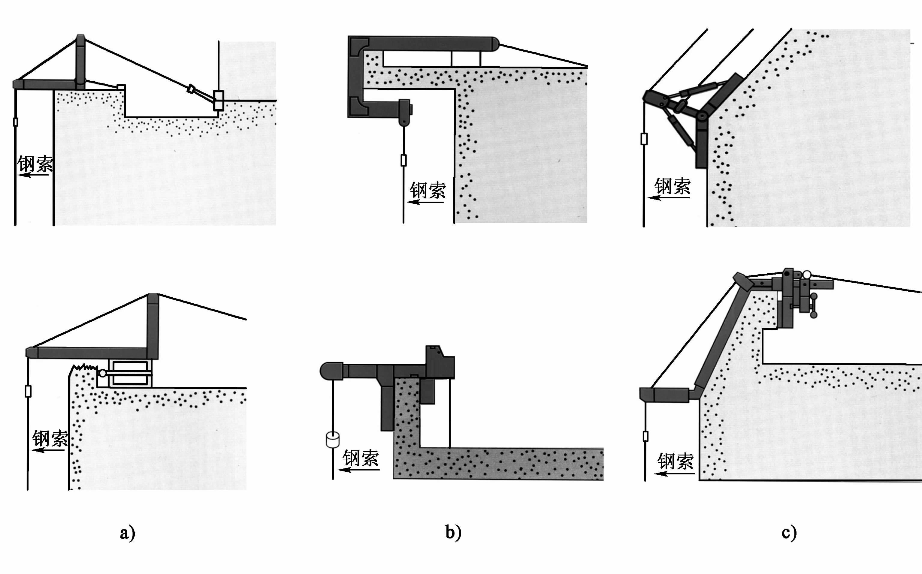 a)L形懸掛機構;b)勾形懸掛機構;c)特殊懸掛機構