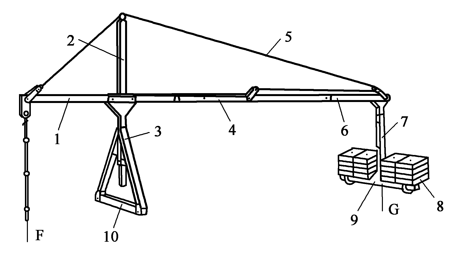 .前梁;2.上支架;3.前伸縮支架;4.中梁;5.加強鋼絲繩;6.后梁;7.后伸縮支架;8.配重鐵;9.后支梁;10.前支架