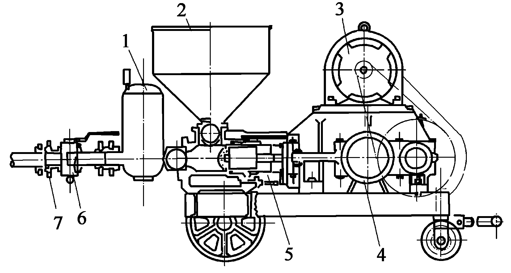 單柱塞式灰漿泵的結構如圖6-4所示,主要由電動機3、減速器4、曲柄連桿機構5、三通閥6、輸出口7和輸送管道等組成。電動機3通過三角皮帶傳動和減速器4使曲軸6旋轉,再通過曲柄連桿機構使柱塞7做往復運動。吸入閥和壓出閥隨著柱塞的往復運動而輪番的啟閉,從而吸入和壓出灰漿。氣罐內有空氣,依靠空氣儲能,當柱塞回程吸漿時,氣罐內的灰漿因空氣壓力繼續輸出,并減少灰漿輸送的脈動現象。氣罐上裝有壓力表,當工作壓力超過1.5MPa時,裝在三角皮帶輪上的過載安全裝置能夠使大皮帶輪停止運轉,以保證安全。